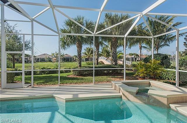 WOW, lowest priced on March 11 with pool, spa, 3+den with views this close to the beach on MLS in all of Naples, Bonita to Estero. A premium lot at end of street with tropical setting and lushly landscaped. DiVosta patented poured concrete exterior wall constructed home 6 1/2 years old and many tasteful after-closing improvements. Gorgeous flooring, generously tiled and extended lanai. Spacious master suite with 2 bathrooms, large walk-in closet and 2 additional closets, high impact slider glass doors leading out to private section of the pool next to privacy wall. Soaring ceilings, newer Oakmont home with double bridge and lake views. Compare lower ceilings new homes to this open modern plan yet with high ceilings. Low fee resort community with over 20 miles of walking and biking paths in the friendly non-golf community with amazing amenities. Low fees only $331 average monthly includes lawn care, irrigation water, 24 hour manned guard gate, active tennis, superb fitness center overlooking breath taking views, enormous resort pool, lap pool, bocce, gas station, town center restaurant and more. Easy drive to Mercato or Coconut Point and beach.