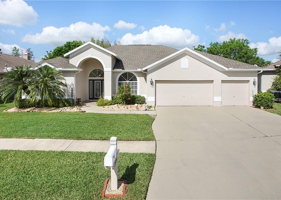 Beautiful 5-bedroom, 3-bathrooms, 3 car garage home in the peaceful community of Meadow Pointe sitting on conservation lot with pond. Grand entrance from foyer to the bright open split floor plan & soaring ceilings throughout including a formal living & dining room. Gourmet kitchen boasts 42" wood cabinets, island, breakfast bar, granite counter-tops, newer vinyl wood-like flooring, good morning room & closet pantry. Kitchen overlooks the spacious family room w/cozy fireplace making it perfect for entertaining. Master suite offers a large sitting room through French doors, walk-in closets, relaxing garden tub, separate walk-in shower, dual sink vanities & private access to lanai. All secondary rooms provide ample space with carpet. Enjoy the amazing Florida weather on your oversized covered & screened lanai through sliders right from the family room. Plenty of luscious wooded conservation views + pond from the extended brick patio. Home has been updated 2 years ago w/the following: new AC system, new roof, new water heater, new luxury vinyl in all wet areas & new granite counter tops throughout. Hurricane shutters are also included. Meadow Pointe is convenient to I-75 & I-275. Only minutes from the Wiregrass Mall less to a Target, Walmart, restaurants, great school, hospitals, this is the perfect location! Meadow Point amenities include pool, playground, tennis, other great common areas within the community. NO HOA & low CDD Included in Taxes. Save money w/reclaimed water for lawn. Home Warranty too!