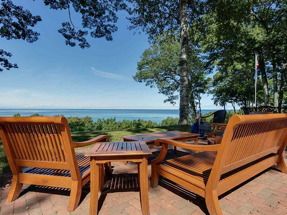 Historic "Bliss Cottage" offering rustic charm along with panoramic Lake Michigan views and beach access. Year round sunsets, lighthouses and passing ships are part of the fun of this wonderful cottage. The "Overlook" cottage features log exterior and cozy wood interior with hardwood floors, stone fireplace and cathedral ceilings. The spacious floorplan offers a large master suite and 2 guest suites with updated baths, wet bar, and laundry. The owner has been meticulous in care and maintenance, making many improvements since purchased in 2015. This is a very special place in a wonderful location.