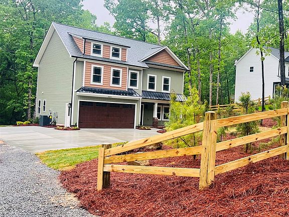 NEW CUSTOM HOME with 2-tier paver patio, fire pit & great view of babbling stream / HARDWOOD FLOORS THROUGHOUT THE ENTIRE HOME (1ST & 2ND FLOORS). Rock steps to creek + Outdoor Lighting / Sod yard / Fence front and side yard & shared entry / Gutters with GUTTER GUARDS Buried and Piped away from home, sewer pump installed / Interior Shiplap Decor Electric FP with blower & cedar mantle / Cedar beams on ceiling / Floating cedar shelving in laundry room / double hung windows. 7' Tall front & back doors. Kitchen has under counter lighting. Backsplash in kitchen, laundry & pantry. Kitchen has white shaker cabinets & granite countertops + Farmhouse Sink / Walk-in Pantry has Gray shaker cabinets / Upgraded black plumbing faucets throughout entire house. Tile shower in master + glass door. Metal roof on front of house (porch & garage section decor). Upgraded lighting package. Large 36" double door closets in bedroom #2, 3 & 4. Craftsman style trim entire home. Pulldown stairs to attic.