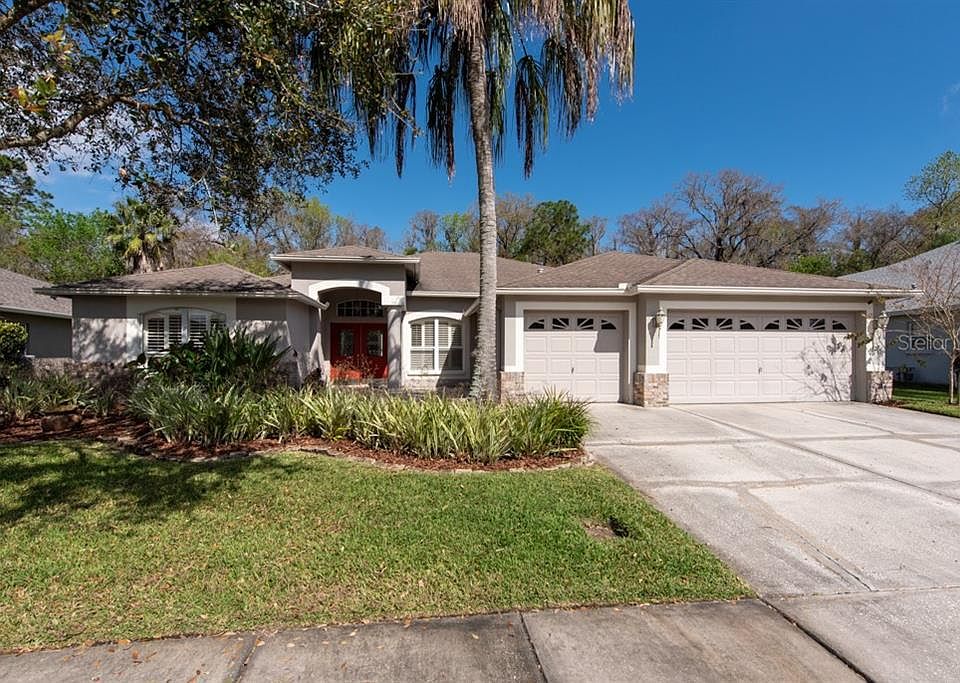 Welcome to Meadow Pointe! This gorgeous 4br/3ba/3cg + OFFICE + POOL home sits on an OVERSIZED CONSERVATION LOT on a quiet CUL-DE-SAC in the heart of Wesley Chapel! An A+ SCHOOL DISTRICT! Showcasing 2760SF of living space and a 3-way split floor plan, some notable interior features include; PLANTATION SHUTTERS, CROWN MOLDING, a large office that is perfect for working from home or virtual learning, and a beautiful UPGRADED chef's kitchen! The kitchen boasts 42" wood cabinetry, GRANITE countertops, STAINLESS STEEL appliances with range, GAS stove, tile backsplash, pantry, breakfast bar, and under cabinet lighting as well as pendant lighting. The spectacular owner's retreat features sliders out to the pool, a huge WALK-IN CLOSET, and a private en suite bath with double vanities, soaking tub, separate shower, and water closet. The 3 additional bedrooms are all bright and offer lots of closet space with built-ins. Your OUTDOOR OASIS offers a huge 22,000 gallon pool with spa, sun shelf, LED lighting with remote, concrete deck, large covered lanai, and wiring for surround sound and cable. A TRUE PARADISE! Additional 'extras' include; garage with shelving and epoxy flooring, large laundry room with sink, landscape lighting, security system, central vacuum system, water softener, and more! Dont miss this amazing home with great Meadow Point amenities, low taxes and NO HOA!