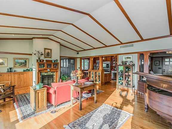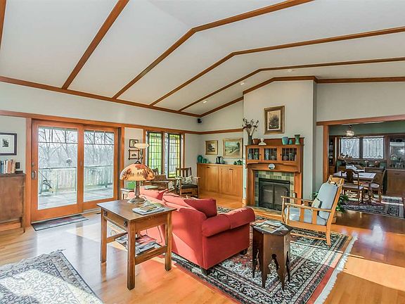 Authentic Prairie style home, surrounded by trees with walking trails to reservoir, yet only minutes from downtown. Well maintained with 5 spacious bedrooms and 3 full baths. Master bath with in-floor heat, private deck/hot tub. Lovely oak floors & antique oak f/p mantel in LR . Lg master closet with w/d. Frml dng w/ Walnut trim & access to scrnd porch & deck ovrlkng wooded 1.63 acre lot. Lower level W/O with lg windows, heated floors, family room, full bath. Extensive landscaping and lwr lvl garden room.