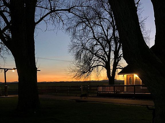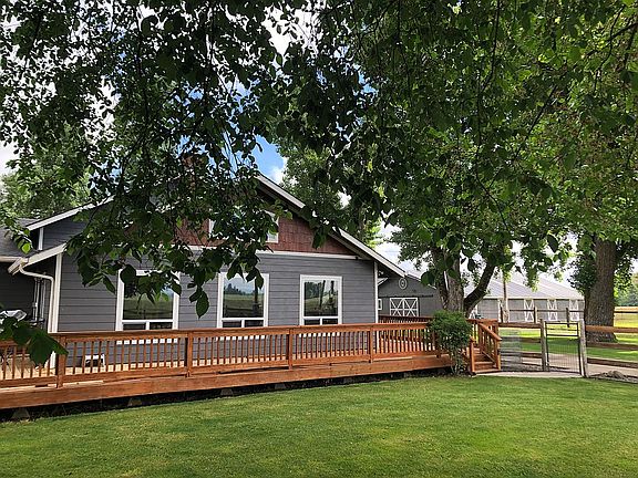 Close to town, airport and amenities. New Hardy Plank siding, fresh paint inside and out, recent updates blended with vintage touches create a comfortable and homey feel. Beautifully updated great room with vaulted ceiling and floor to ceiling riverrock fireplace and pellet stove. Combined dining and sun room with lots of windows for a magnificent view of mountains, sunsets and the airport. 3 bedrooms, 2 full baths, 2nd floor bonus/theater room or could be 4th bedroom. 1st bedroom has walk-in closet with barn doors, 2nd bedroom has walk-in closet and French doors, and all 3 lower level bedrooms are freshly painted with new flooring. One bath has tile floors and glass brick and tile shower, while the other boasts new flooring, shiplap and farmhouse vanity. Large kitchen has custom hickory cabinets with plenty of storage and pull-outs for easy access, tile floor and countertops. The house is updated with heat pump/central air, large laundry room, artic entry, lots of LED lighting, expansive deck with hot tub on concrete pad, entertainment area with a fire pit and food and beverage rail and fenced yards. The property has fenced 4 acre pasture, fenced smaller pasture, lawned paddock in front of barn, 80x100 sand outdoor arena, warm up arena, chicken coop, beautiful pond with stream, grand, gated entry with led lighting overhead. Much of the fence is wood rails with welded wire. Outbuildings include 9 stall horse barn with tack room and foaling stall, hay/equipment storage barn with 17 foot clearance, garage with shop area and bonus upstairs with room for office or storage, extra older shop for storage with separate heated office and a covered dog kennel with a concrete floor. Property has drain tiles throughout, two wells with excellent output, 2 electric service drops with separate meters, circle drive with second gate, plenty of gravel parking, paved driveway and parking, 30 Amp RV hookup with water plus 50 Amp RV hookup at back of garage.