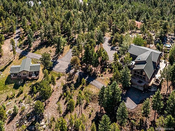 A picturesque private drive leads you to this Stunning Mountain Contemporary with Mt Evans & Sweeping Mountain Views plus an exceptional GUEST HOUSE on 3.35 pristine acres. The owners have put this beautiful home through an extensive whole house remodel. The finest in fixtures, finishes, floorings, materials and craftsmanship were sought and achieved. The welcoming Covered Front Porch opens to the Main Level that features the Great Room with Cathedral Cut White Oak Hardwood Floors, towering Fireplace, Custom Built-In's and Expansive Windows that fill will those Mountain Views. The open Gourmet Kitchen will delight. 12 Foot Quartz Island, Custom Cabinets, Under Cabinet Lighting, Honed Granite Counter Tops, 6-Burner Wolfe Gas Cooktop, Double Ovens, Warming Drawer, Sub Z, Walk-In Pantry and more. A Remodeled Half Bath, Two Bright Bedrooms with Remodeled En-Suite Baths. And the Bonus Room that can be used as a Media Room or Formal Dining, complete the Main Level. Upstairs you'll find the large Open Loft with more views. And the Primary Suite that will impress! With an amazing Spa-Like Bath, Private Balcony, Coffee Bar, Custom Walk-In Closet and spacious Bedroom with Arched Ceilings and wonderful Accent Wall. The Lower Level features the bonus Living Area, Awesome Wine Cellar, Non-Conform Bedroom, Work-Out Room, Remodeled Full Bath and Laundry. Other features include the Wrap Around Deck and Garden Path to the Hot Tub and enchanting "Valley View" Spot. The Guest House is finished in the same high quality finishes of the Main House and features 1 Bedroom, 1 Bath, Living Room, Laundry and Full Length Deck. The grounds have multiple areas and paths to enjoy and explore. The two inspiring sculptures accent the grounds. The location is excellent. This home is on one of the very best lots in all of Evergreen Meadows. All paved roads. 10 minutes to shopping, restaurants, grocery, schools and more. But so quiet and peaceful. This is a super rare find and a must see property.