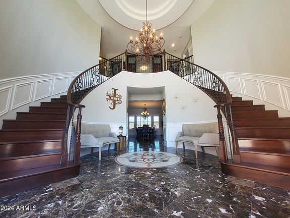 This stunning home in Gilbert is truly remarkable, offering an array of features and upgrades that elevate it to the epitome of luxury living. From the moment you step inside, you're greeted by a grand dual staircase, setting the tone for the elegance and spaciousness that permeates throughout the residence. Boasting 5 bedrooms and 4.5 baths spread across 5128 square feet of living space on half an acre, this home provides ample room for both relaxation and entertainment. The recent improvements underscore the meticulous care and attention to detail invested in the property, with highlights including all-new windows, a freshly painted exterior with a stylish brick facade, and newly installed French doors leading to the backyard. The Chef's dream kitchen is a focal point of the home, featuring an abundance of room and storage, upgraded appliances including a Sub-Zero fridge and Wolf Double Oven, granite countertops, soft-close drawers and cabinets, and updated hardware. A trash compacter adds to the convenience and functionality of the space. The addition of a guest suite on the main floor with a private entrance enhances the versatility of the living arrangements, providing flexibility for various lifestyle needs. The backyard oasis is nothing short of spectacular, with a $200,000 pool stealing the spotlight. Boasting luxurious amenities such as a hot tub, grotto, colorful lighting, serene water features, baja steps, pool seats, and a waterslide, it's a paradise for outdoor relaxation and entertainment. The newly installed BBQ, patio extension, misters, ceiling fans, and lighting further enhance the outdoor experience, creating an inviting space for gatherings and enjoyment. The owner's artistic touch is evident throughout the outdoor space, with a mural and mosaic adding a unique and personalized element to the ambiance. The central location adds another layer of appeal to this already outstanding property, offering easy access to the 202 Freeway and the San Tan Village shopping and restaurant district, ensuring convenience and accessibility for residents. In summary, this home seamlessly combines luxury and functionality, making it a highly desirable property for those seeking their dream home in Gilbert.
