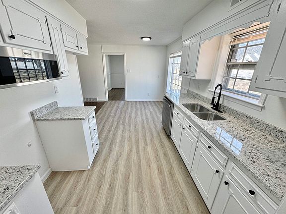 Beautifully renovated 4 bedroom 2 bath home with over 1900 sq feet. This home has gone through a makeover including a new roof, new luxury vinyl planks, and refinished hardwood floors. In addition, the kitchen received new granite countertops, new st steel stove (to be installed at closing), microwave, and dishwasher. Both bathrooms have been remodeled. The primary shower was completely updated with tile surrounds, matching tile floor, and granite vanity top. The second bathroom has a new vanity, and a beautiful tub surround and matching tile flooring. This home also features a complete matching package of black fans, light fixtures, door and cabinet hardware to make everything flow. New plumbing fixtures throughout. The back yard is completely fenced in with a 6ft privacy fence and a large two car garage. Set your showing today before this home is gone!