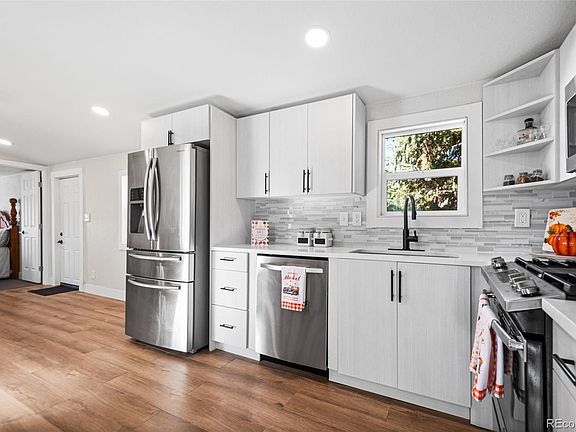 Welcome to this gorgeous 3 bed 2 bath completely remodeled home in the Front Range community! Enter into this bright and open floor plan with all new paint and new vinyl flooring. There is new siding on the exterior and brand new furnace. The kitchen has contemporary white cabinets and contemporary finishes and all new stainless steel appliances including a gas stove are included! Plus white quartz countertops and custom contemporary glass backsplash. The primary bedroom is very spacious with a walk-in closet and private bathroom. The primary bathroom has beautiful tiled floors and tile to the ceiling in the step-in shower with custom shower floor tile and a new vanity and quartz countertop. The secondary bath has also been remodeled with new tile floor, tile to the ceiling in the tub surround and new vanity and quartz countertop. Both bathrooms have all new oil rubbed bronze fixtures. There is a separate laundry area. Love your outdoor living space with a large deck to enjoy the fall weather, plus there's a flower built-in flower planter. On the other side of the home there's a seasoned tree and grassy area, plus 2 off street parking spots. This home backs to a greens belt, a rare find. Enjoy your community amenities with an open space, playground, swimming pool and clubhouse. This home is divinely located near Westlake Park and Bronco Park, also nearby is shopping and dining and quick access to I-25.
