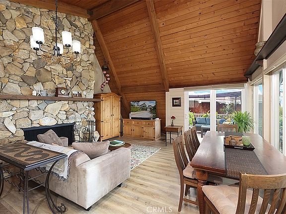 On the market for the first time in decades, the original 1974 design gives the feeling of a mountain cabin sanctuary with soaring beam ceilings, an open "Great Room" with sweeping views stepping out onto a large entertainment deck with plenty of room for parties, an herb garden, etc. The main living area, with a ski-lodge scaled wood burning stone fireplace is upstairs offering the best views and the Master Suite, also featuring high open beam ceilings, is on this level. Downstairs features 2 bedrooms, a separate office/study/studio with a second stone fireplace, a large bath and full laundry room and another bonus room (currently home-office). This is a unique and fun property with a gorgeous setting in one of the most sought-after neighborhoods in Laguna and it is priced to sell.