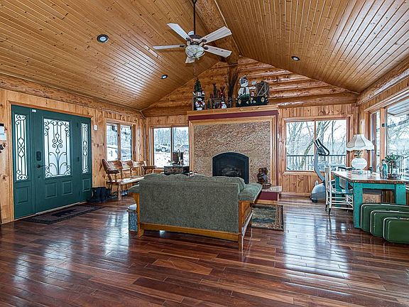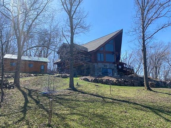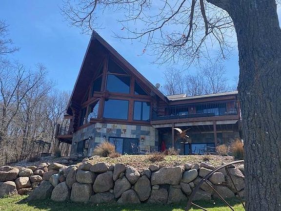 Sundown Lake, Iowa-A 400 acre private lake. One of Iowa's best-kept secrets! This gorgeous, authentic, hand-peeled, full red cedar log home, welcomes you to 257 feet of lake frontage with a sandy beach area and its own floating dock system at private Sundown Lake! Custom design and superb finishes such as granite countertops, tiled bathrooms, and hardwood floors are throughout the home. With nearly 4,000 well thought out finished sq ft, this 4 bedroom, 3 bath home has plenty of space for friends and large family gatherings. A concrete driveway leads to this landscaped, serene, property with a two-stall heated garage. Several low-maintenance poly decks and a concrete patio are perfect for entertaining and grilling. The centerpiece of the home has a jaw-dropping prow with three story floor-to-ceiling windows offering a panoramic view of the water and stunning sunsets. The open-concept great room features a kitchen, dining area and living room with a massive granite gas fireplace. The kitchen has custom cabinets, a granite-topped island with a sit-up-bar, and a full appliance package is included. Overlooking the great room sits a loft with a private master bedroom suite. The lower level boasts a family/game room area, custom bar, and walks out onto the beautiful spacious concrete patio with a full view of the lake. A meandering path from this lower patio takes you down to your own sandy beach and dock area. Here you can fish, swim, boat, or just bask in the sun and enjoy watching the activity on the lake. Whether you live here full-time, or use this beautiful home for a weekend retreat, this immaculate home is in move-in condition. The owner is also willing to negotiate a package deal, making this nearly a turn-key opportunity for you to own at one of the fastest growing private lakes in Iowa. Please call ahead to view this beautiful log home.