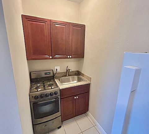Newly updated, fresh paint, updated appliances, full-size bathroom. Small 5-apartment building above 2 retail spaces. Complex has coin-operated laundry room.