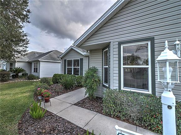 Lovely Wisteria Designer with 3 Bedrooms and 2 Baths. Situated on an Offset Homesite with No Kissin' Lanais behind, and a desirable SOUTHERN EXPOSURE! One of the best locations in The Villages, Village of Belvedere, you are close to major shopping, pools and Rec. Centers. You'll love the direct access to the Kitchen from the Spotless Garage, and the abundance of Cabinets and Counter space, Pull-Out Shelves and cooking with NATURAL GAS! The kitchen has an Eat-In Breakfast Nook, French door Refrigerator, and the Dishwasher and Disposal are practically new. Plus there is a WHOLE HOUSE WATER SOFTENER and FILTRATION system. The Living/Dining Room has VAULTED CEILINGS and a Solar Tube for more natural light. There is beautiful Laminate Floors throughout - NO CARPET! The Master Suite has a Walk-in Closet, Dual Sinks, Linen Closet and Roomy Tiled Shower in the bathroom. The Split Plan is great for Guests with 2 Spacious Bedrooms and Full Bath with Tub/Shower Combo and Sliding Glass Doors. Enjoy the SCREENED LANAI with more PRIVACY than most interior lots. A super buy in a super Location! Washer & Dryer do not convey. Tax line reflects property taxes only. CDD line reflects combination of annual bond $717.65, annual maintenance $524.64 and fire district $81 for a total of 1,323.29. Bond Balance $7,613.34.
