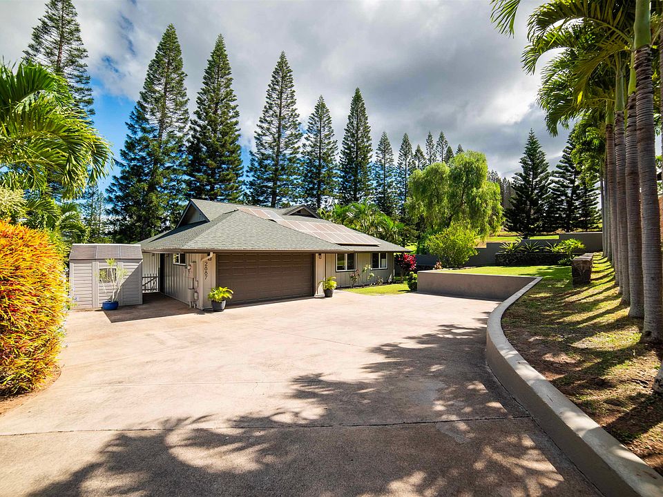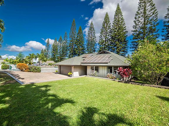 This beautiful, move in ready home sits on the 10th fairway of the Pukalani golf course offering a great setting overlooking the course and the pond. Recently remodeled this home is in immaculate condition. Upgrades include a hot tub, new gutters, 2 brand new bathrooms, new vinyl flooring, 2 split AC units, blinds and interior/exterior paint. A 17 panel owned photo voltaic system will keep your electric bill to a minimum. This home boasts a covered lanai, large walk in panty, separate laundry room and large closets in all 3 bedrooms. A hot tub, outdoor shower, great outdoor space with a fully fenced back yard and the privacy of a flag lot in a cul de sac makes this home a pleasure to show.