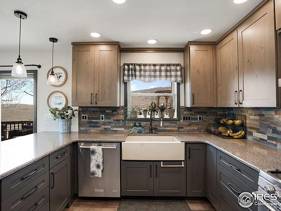 A true oasis! Enjoy privacy and views of the foothills, plains, and city lights surrounded by preserved open space. 5 acres with fully electrified fence. Beautiful cedar siding and a professionally upgraded backyard living space with pergola, firepit and large deck. Many mature trees, a garden, garden shed with power, and perennial flowers make for a wonderful outdoor experience! Many recent updates include remodeled kitchen with quartz counters, stone backsplash, farm sink, wood floors, and stainless steel appliances, new flooring, paint and doors. Bring your telescope - newly remodeled primary suite has amazing views of the stars! The walkout basement is newly finished with a living area, and additional primary bedroom suite. The shop has an oversized door, full RV hookup, welder outlet, bathroom, and exceptional storage. Bring your horse, cows or other livestock! Huge dog run, pasture with alley way, loafing shed, heated tack room and barn with stall, turnout and hay storage for all your animals! Next to Coyote Ridge trail and others - best of country living but so close to the city! No HOA!