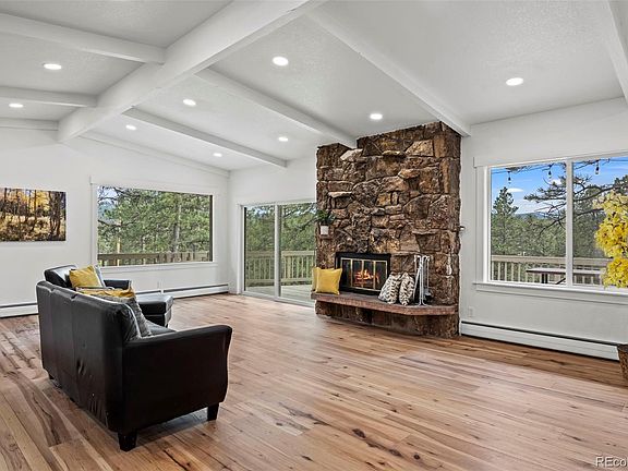 Situated in the heart of Evergreen, this fully remodeled ranch home offers stunning views and a peaceful setting on a mountainside. The main level layout features an open floor plan perfect for entertaining, with a cozy fireplace in the family room creating a warm atmosphere. Abundant windows flood the space with natural light and provide access to the deck for enjoying sunsets. The kitchen is a chef's dream, offering ample space for meal preparation and gatherings. Complete with stainless steel appliances including wine fridge, granite countertops, and eat-in area. The primary suite on the main level boasts a spacious bedroom with a fireplace, en-suite bathroom, walk-in closet, and convenient laundry area. The lower level offers a private guest retreat with a family room, wood-burning fireplace, fridge, sink, and dishwasher, as well as a bedroom, full bath, huge gym, and ample storage in the walk-out basement. The circular asphalt driveway ensures quick snowmelt during winter months. Located near Jeffco Open Space Parks, Evergreen Lake, schools, shopping, and dining, this property provides easy access to I-70 for commuting to Denver or exploring the mountains. Don't miss out on this incredible opportunity to own a piece of Evergreen paradise!