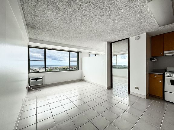 Great corner unit with gorgeous views of ocean, mountain, and Diamond Head! This 1/1 offers 350 square feet of living space, window air conditioner, and has one dedicated parking stall. Glass pane windows allow for plenty Hawaii sunlight to make this home bright and airy. Take a dip in the saltwater pool to cool off on a tropical day, play a match of tennis or a game of basketball, or meet with friends in the recreation room-all part of the amenities at Five Regents. Feel safe and secure with 24-hour security on sight. Condo comes with 1 covered parking space and there is also guest parking available and community laundry. This home is conveniently located in Salt Lake close to everything Oahu has to offer. Less than 2-mile drive to Fort Shafter, and a quick 8 miles to Pearl Harbor/Hickam AFB. You are also close to the Nex, Commissary, Safeway, elementary schools, and the Bus line. Water and sewer included with monthly rent. Rental is internet and cable ready. Sorry, no pets & no smoking. One year lease required. All prospective tenants above the age of 18 must fill out an application. Credit check required.