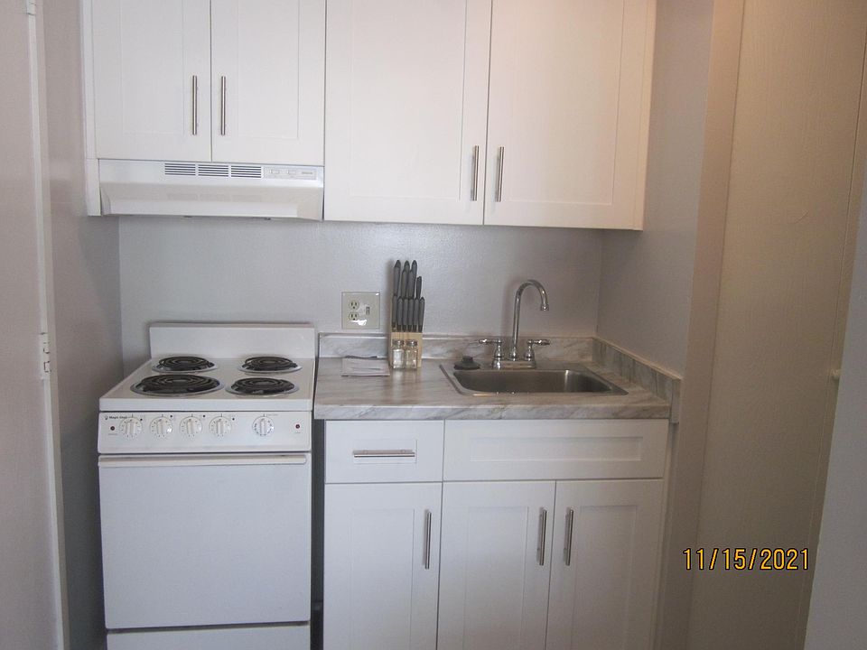 Fully furnished renovated studio with white shaker cabinets, luxury vinyl flooring, A/C unit and 1parking stall. secured building has swimming pool, tennis courts, basketball courts and more. Water and sewer included tenant pays all other utilities. No pets and no smoking.