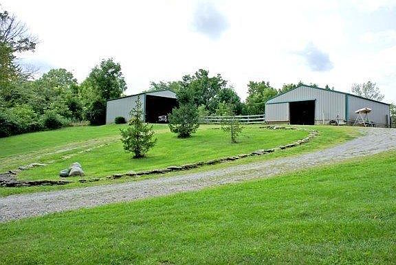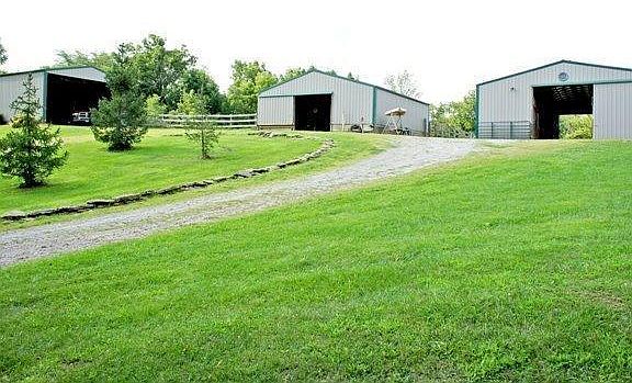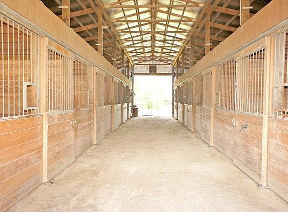 Features 12 stall horse barn w/tack & storage rooms, separate equip barn with 2 add'l stalls, open garage & 3 add'l animal shelters. Access to trails.
