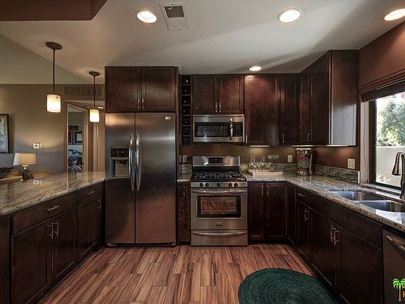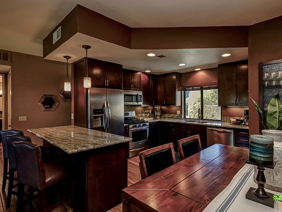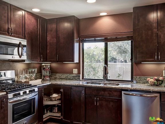 GORGEOUS Alameda Plan condo with 2 ensuite masters, reconfigured gourmet kitchen, gas stove, dining area with skylight, upgraded bathrooms, ceiling fans and updated lighting situated in a lovely tranquil setting with beautiful pond and golf course views. Enjoy majestic desert sunrises from your private east facing patio surrounded by mature citrus trees. Tastefully furnished per Seller inventory. Highly desirable Isleta Court, steps to the fitness center, tennis, pickle ball and basketball courts, driving range and Club. HOA dues include Club social membership, basic cable plus HBO and Showtime, fitness center, tennis, pickle ball, basketball, bocce, 33 pools and spas, and owner discounts for pro shop, green fees and golf membership for the 27-hole championship golf course, Mountain View Grille, Hotel and full service spa. Minutes from downtown Palm Springs and the airport. Perfect for year round living, a relaxing retreat or vacation rental. MUST SEE!