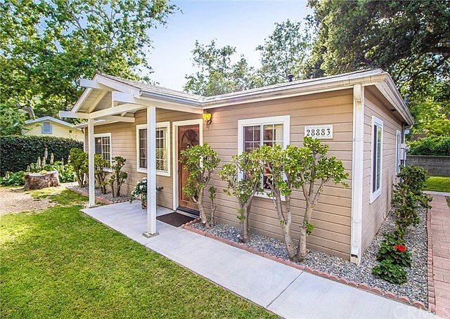 Quaint creek-side cottage nestled in the heart of Modjeska Canyon. Located off the main road just 1 block from the Madame Modjeska Historical property, this home enjoys serenity and privacy. Relax under the majestic oak and sycamore trees and enjoy the creek views. Enter into the living room and dining area which enjoy a cozy wood-burning gas fireplace and office nook. The kitchen features a garden window overlooking the grounds and includes a refrigerator and new gas stove. A ceiling fan and mirrored closet doors are featured in the master bedroom. The bathroom enjoys a tub with shower, linen closet and tiled flooring & counters. Interior amenities include recessed lights, dual-paned windows, gas heater and wall A/C unit. Separate storage building with workshop and laundry room, washer and dryer included. Both the front and back yards have plenty of space for gardening.The fully fenced grounds are ideal for animals and feature a large, weather resistant composite wood deck with gazebo that is great for entertaining. The property is zoned to allow chickens and farm animals. Large driveway with parking for 3 cars, Walking distance to the Modjeska Community Park, Tucker Wildlife Sanctuary and Cleveland National Forest with miles of mountain biking and hiking trails. 10 minutes to shopping and 35 minutes to the beach.