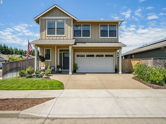 Welcome to this modern property in desirable Kooiman Estates w/ no HOA! Tucked away on a low-traffic, dead-end street, you'll be captivated by its open floorplan featuring custom cabinets, stylish kitchen island, sleek quartz countertops, and gas cooking appliances. The shiplap detailing surrounding the gas fireplace and contemporary trim add a touch of charm. Make your way upstairs, where you'll find a versatile loft area, laundry room, bathrooms, and inviting bedrooms. The spacious primary suite is a sanctuary of relaxation, complete with a tiled, walk-in shower, double sinks, separate toilet room, and a generously sized walk-in closet. The fenced backyard wraps around the expansive corner lot to provide a manicured lawn with sprinklers, covered patio with plank ceiling detail, and concrete slab for bbqs, fire pits, and hot tub! Thoughtfully designed with energy efficiency in mind: boasting a furnace, instant hot water heater, A/C, and a newly installed generator inlet. A neighborhood path leads you to a Walnut Vale Park where swings, a basketball hoop, and a play structure await. Located in close proximity to other nearby parks, like Rivenes Park offering a delightful splash fountain. Experience the vibrant community of Hubbard, with its annual Hubbard Hopfest, charming parades throughout the year, and enchanting Christmas Tree Lighting event. Indulge in the culinary delights of the area, with local favorites such as Le Petit Bistro Cafe, Trapala 2, Hubbard Inn, Topwire, and a range of food carts in Woodburn. Situated just south of Wilsonville, you'll enjoy convenient access to popular locations like Target, Costco, Bullwinkles, Bauman Farms, and more. Plus, the Woodburn Premium Outlets, Walmart, and the delightful Wooden Shoe Tulip Festival are only a short drive away. Don't miss the chance to make this exceptional property your own in a quaint community with easy access to both I-5 and 99E.
