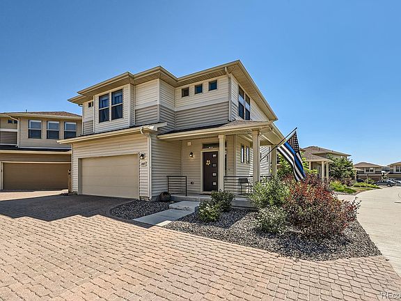 Built-in 2018, this spacious two-bedroom, three-bath floorplan is beautiful and is move-in ready! The upstairs has two bedrooms, two bathrooms, and a flex room that may be converted into a third bedroom, or utilized as additional comfortable living space or an office. The main level has wood flooring, with numerous windows that bring in natural lighting. The open layout from the kitchen to the living room makes a great gathering place joining at the oversized island. Also on the main level is a powder room. The front yard has been Colorado-scaped and just off the kitchen is the backyard. The fenced backyard feels private and has been landscaped with gorgeous synthetic turf making a great environment for any kids/pets, to host a gathering, or simply to sit back with your coffee, and enjoy the lovely mountain view. This home is stylish and part of the master-planned community, The Meadows. The Meadows has a lot to offer, from parks and pathways to community events and pools!