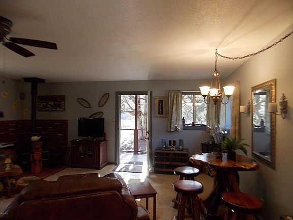 This immaculate and cozy little cabin features a very open floor plan with a front covered deck for your ultimate enjoyment in the mountains. Nestled back onto a heavily treed lot that is completely fenced with an RV gate, and metal carport. The partitioned sleeping area - plus potential room to add on and create separate bedrooms. Comes with all appliances, gas stove for heat and most of the furniture and furnishings. Attached storage room as well - This is a quality cabin at this price.