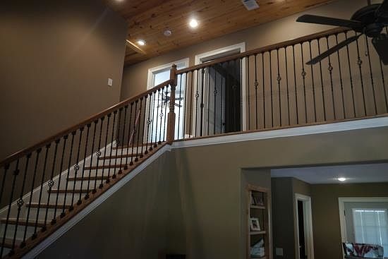 Custom "Craftsman" home on 5 acres - completed in summer 2012. Nearly 2000 sq ft heated space, with 18x8 covered front porch and 18x18 covered rear deck. Exterior is board and batten vinyl, with cedar shake shingles in the gables. Galvalume roof and gutters. Knotty alder custom cabinetry with solid surface tops, stainless Frigidaire appliances, new Frigidaire high efficiency washer/dryer. Double pane/double hung craftsman windows. ALL FIXTURES AND APPLIANCES CONVEY. Home has spray foam insulation making for very low power bills. Hardwood floors (red oak) throughout.. Tile baths and large walk in utility/pantry. Red oak and iron staircase, built ins, and many other custom features. Full baths have double vanities, all house trim is oil-rubbed bronze, all cabinets have crown molding. County water. Plenty of big deer and turkeys.