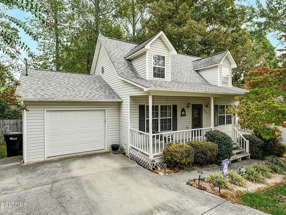 Welcome home! This move-in ready Cape Cod style home is conveniently located in the Hunter's Trail subdivision. Less than 30 minutes to Knoxville or Oak Ridge. The covered front porch and spacious back deck with fenced in back yard and firepit provide relaxing outdoor living spaces. The primary bedroom with en suite bathroom is located on the main level. The eat-in kitchen area has French doors that open up to the back deck, stainless appliances, as well as a utility closet. Spacious one car garage offers some extra room for storage. Upstairs, there are two additional bedrooms with a second full bathroom.