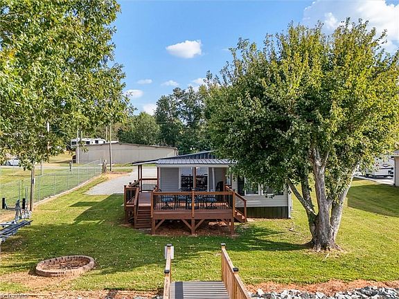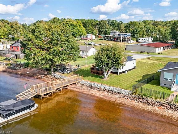 CHAMPAGNE TASTE BUT BEER BUDGET? ARE YOU LOOKING FOR THAT MILLION DOLLAR VIEW ON HIGH ROCK LAKE WITHOUT THE MILLION DOLLAR PRICE TAG? You will not find a nicer home on big water at this price point. Views for days and intoxicating sunsets in Abbotts Creek! This 2BR/1BA home has an open kitchen/dining/living area with large lakeside deck/covered porch. Refrigerator included. Private pier and floater with composite decking installed in 2022, rip rap retaining wall. Level lot with firepit & storage bldg. Updates within the last year include metal roof, vinyl siding, gutters, windows, interior paint, plumbing fixtures, mini-split heat pump & the list goes on. No closet in primary BR, second BR is less than 80SF, ceiling height is slightly below 7 feet throughout home.