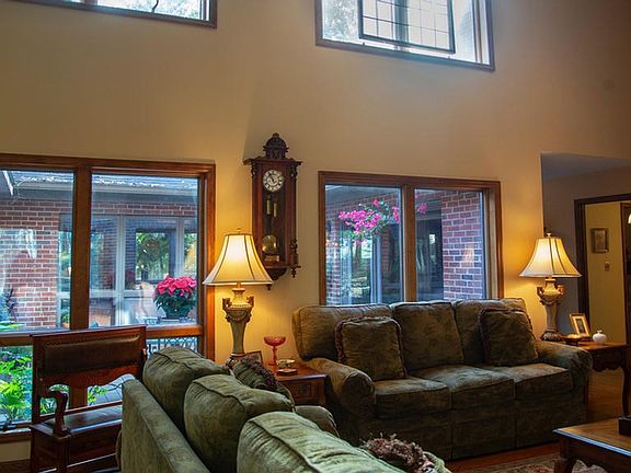 Spacious 5 bedroom, 3.5 bath contemporary home sits on 7.35 acres. Living room, formal dining room, den, and kitchen all surround a center courtyard. Hardwood and tile floors throughout, skylights in several rooms. Master bedroom has sitting area and 2 walk in closets. Master bath has double vanities separated by a jetted tub with beautiful stained glass window, water closet and separate shower. 4 bedrooms and 2 baths on opposite side of house each share a bath and have small entries that can be closed off from rest of house for privacy. This home also offers 2 attics one of which is quite large and the crawl space is encapsulated for more energy efficiency. Outdoors you will find a patio and several decks for enjoying the outdoors. Gunite pool and Pool house with kitchen, great room, sleeping loft, full bath and bonus room that could be another bedroom or office. This truly is a special property.