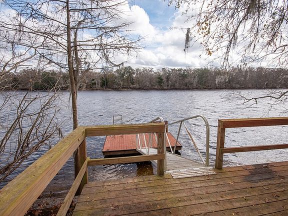 The home you have been dreaming of located on the gorgeous Suwannee River in a highly sought-after area! This home features beautiful cedar plank walls and valued and beamed ceilings that give the home a cozy cabin feel. Upstairs there is a lovely covered porch that wraps around the entire house and a screened-in porch providing tons of different locations to sit and watch the river flow. The open-concept living area features a gorgeous stone fireplace that can be viewed from the kitchen and dining areas. Downstairs is the perfect area for a guest suite or game room with a large kitchenette, a full bathroom, and plenty of room for a bed or pool table. The other half of the downstairs is an enclosed workshop with a garage door. This home is just a short boat ride upriver to the Suwannee Belle Landing and a quick drive to shopping centers. Enjoy sitting out on the floating dock just steps from the front door of your cozy river cabin! Call today to schedule a private tour!