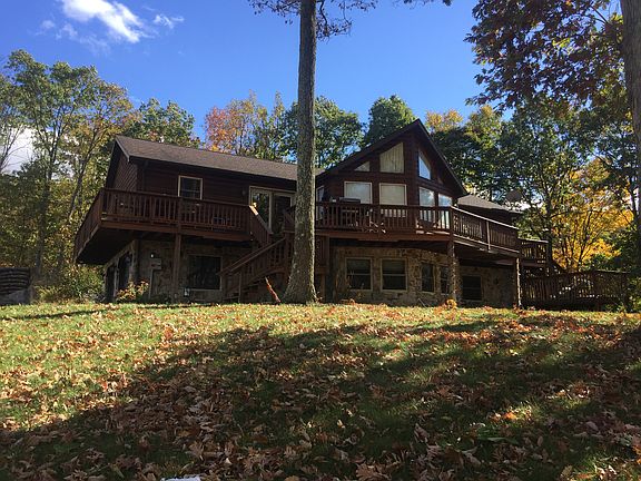3300 sq/ft house, garage and 16 secluded acres. Upstairs: 3 bedrooms (2 master bedrooms 1 with gas fireplace), 1 powder room, walk in pantry, kitchen, dining, living room, deck on side and front. Downstairs: 2 rooms that could be bedrooms, office, sewing room etc., large bathroom with shower, sink and toilet, family room with pool table, 2 car garage. Outside and outbuildings: A large tree house for the kids with electricity partially wired. 32 x 40 garage with more than half used as a garage that also has a 16' overhead door for big equipment. The other side is a personal butcher shop that has a large cooler with glass doors, stainless steel sinks, old antique kitchen stove used for baking and heat, and a place set up to make scrapple with propane. Both sides have concrete flooring and running water, along with a propane water heater. Another roofed but open sided building with concrete floor was once used as a dog kennel. Woods all around with no neighbors in sight. Unlimited access to hunting right outside the door. A trout stream nearby. Has the potential to be a bed and breakfast or for a large family. Send me a private message for more information and/or to set up an appointment. Serious inquiries only please.