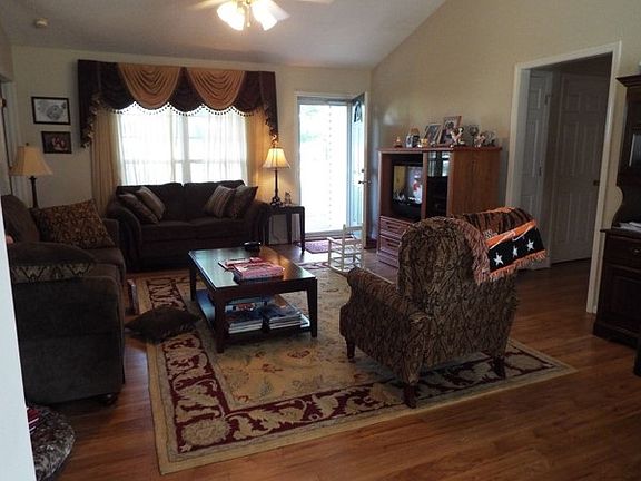 Beautiful neighborhood with lots of children and adults of all ages. Wave and speak to neighbors as they walk while sitting on the large front porch or take a stroll around the large circle with your children and pets for a great workout. Enjoy cooking out on the back patio and large fenced back yard complete with mountain views. Park your vehicles in the double garage and enter the mud room/laundry room into the galley kitchen area. The living room and dining room are open and all rooms (except kitchen and baths) have beautiful laminate flooring. The great room area also has ceiling fans and a cathedral ceiling. The large master with a walk in closet is separated from the 2 other bedrooms and all these have ceiling fans too. This home is set up with a good floor plan and it is just the right size for a small family or empty nesters. Don't forget that this is a rural area and sunsets are beautiful across the mountains you can see from many areas of the neighborhood. It is a very friendly neighborhood and close enough to shopping and dining but also quiet and peaceful.