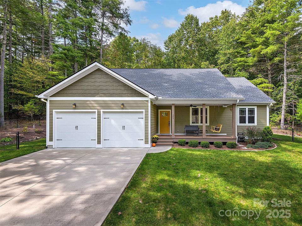 Modern Comfort Meets Outdoor Adventure! This beautifully maintained 3BR/2BA home, built in 2020, offers the perfect blend of style, function, and location. Enjoy warm Southern mornings on the charming covered front porch, and entertain with ease on the stamped concrete patio featuring a grilling area and firepit—all within a fully fenced backyard. Inside, you'll find rich hickory wood floors, a desirable split bedroom floor plan, and a hybrid heating system (electric + propane) for year-round comfort. Wired for a generator, this home is ready for all seasons. Additional perks include a covered back porch, concrete driveway, and NO HOA! All this just minutes from Downtown Hendersonville and the natural wonders of DuPont State Forest—a true recreational paradise with world-class mountain biking, hiking, and waterfall adventures. Don't miss this turnkey gem!