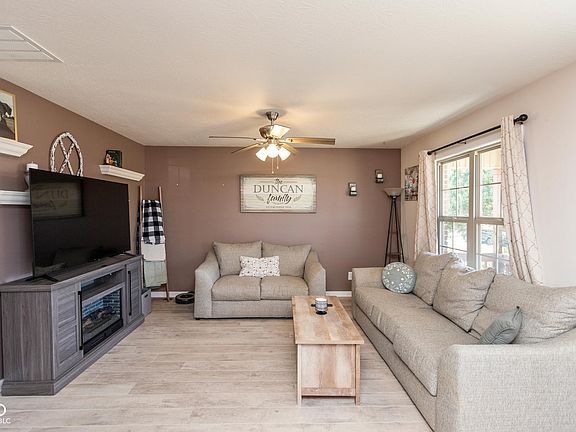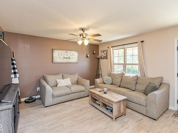 Covered front porchBeautiful tray ceilingBack patioUpdated bathSpacious kitchenTiled backsplashLarge family room