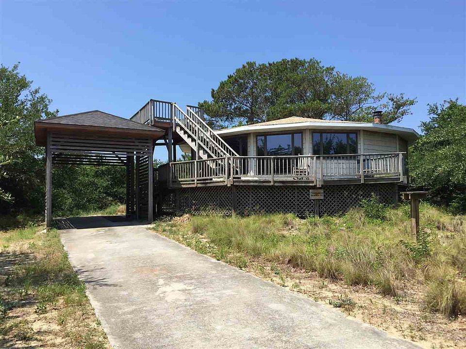 Least expensive home in Southern Shores! Dare to be different and become the next owner of the home affectionately know as "The Round House". This 15-sided Polygon home is a fantastic opportunity that allows you to buy in Southern Shores at a lower price point! For clarification that means it is an older home that is a diamond in the rough waiting for your updating & remodeling. HGTV viewers will know how to make this retro house super cool! There are expansive walls of windows in this home that let in lots of light. Cathedral ceilings are found in the great room, kitchen and all 3 bedrooms. The kitchen is offset for privacy and the laundry is conveniently located inside the house. Home has Andersen windows and vinyl shake siding. Septic tank and drain field replaced in 2012. Newer HVAC. Lots of sun/covered decks (some need replacing) including a private one off the master bedroom. If that's not enough outdoor space there also is a patio in the backyard with a park grill. Insurance info in associated documents. The property is in an X Flood Zone so no Flood Insurance Required! Under house storage. Join the optional Southern Shores Civic Association for a yearly fee of $50 and get access to an incredible amount of amenities such as ocean & sound access including parking, tennis, parks, playgrounds, green space areas, 3 marinas and a boat ramp. Previously rented year-round for $1,300 per month. The price reflects any updating/remodeling/repairs the house may need. Feel free to have inspections, but this property is being sold "WHERE IS, AS IS".