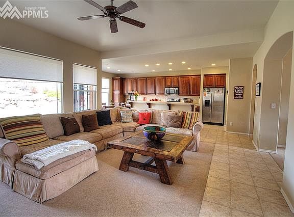 Beautiful ranch home in Pine Creek, backs to Mountain View Elem and Challenger MS play fields. Large kitchen with newer stainless appliances, large island, eating nook, and access to backyard and patio. Walk-in pantry and laundry room. Main level also includes large great room, dining room, 3 bedrooms, and 2 baths. Basement half finished with two bedrooms and full bath. Unfinished space of 971 sq ft has great potential for additional entertainment space. New furnace (Apr 18). Private backyard with large patio. Surround sound in family room. Fenced backyard with gate to school play fields. Located on a cul-de-sac in a great neighborhood of Pine Creek. Easy access to I-25 and Air Force Academy.