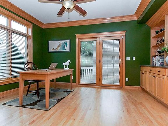 Elevate from the everyday in this custom luxury home on almost half acre lot, overlooking the 18th hole at Hunters Ridge Golf Course! A soaring two story with so much to offer! The beautiful kitchen features upgraded cabinets, granite prep island, eat in kitchen area & spacious formal dining room. Main level office with built-ins and its own private covered patio and entrance. The oversized master bedroom is a show stopping retreat that includes a stone surround fireplace, reading nook with balcony overlooking the golf course, radiant floor heating in recently renovated bathroom with elegant soaker tub, walk in tile shower with dual shower heads and a large walk-in closet! The lower level is an entertainer's delight with a newer wet bar, kitchenette, family room with cozy fireplace & space to enjoy the big game. Updated half bath and a flex/game room. Outside relax on the lovely covered maintenance free deck, a peaceful space to enjoy those beautiful sunsets by the gorgeous stone fireplace. Wired for tv & surround sound, additional added touches for this amazing area. Over 5 stalls of garage space, total 1545 sq ft. The detached 2 car heated garage, currently being used as home gym, has pull down attic stairs for storage access. Brand new roof (50 year warranty), siding, gutters and downspouts. Some more amenities include: 4 fireplaces, irrigation system, refinished hardwoods, new carpet, fresh paint, newer windows, wrought iron fencing, new stately front entry door, dual zone heating, drop zone off garage, central vac on main floor, and so much more!
