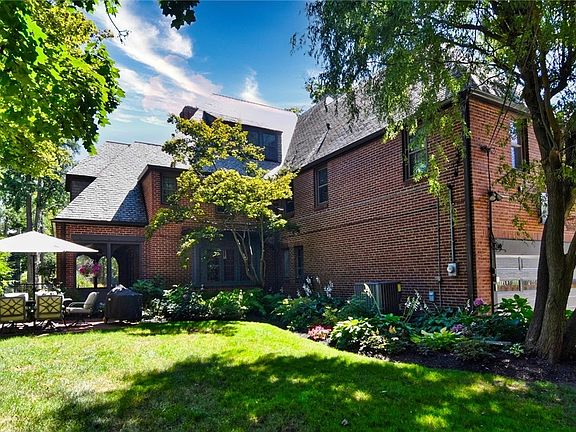 Beautiful Brick and Stone Tudor with many custom architectural details throughout. Sharp curb appeal with argyle pattern accent and detailed brickwork on chimney. Carved front door and original tile welcomes you into your new home. Living room and dining room features plaster moldings and decorative leaded glass windows. Living room is anchored by a wood burning fireplace with sandstone surround and decorative molding. Library off living room is a cozy spot to gather with family overlooking backyard. Stylish white kitchen with leathered granite counters and stainless appliances and custom tile backsplash. Open plan kitchen includes a dining area with decorative cabinetry. Second floor features 5 bedrooms and 3 full baths. The primary suite feels like a retreat with a generous bedroom with fireplace, separate office, original dressing room and renovated bath with glassed in shower. Two bedrooms share a fully updated jack and Jill bath and there is an additional suite at the back of the house. Third Floor is unfinished. Finished basement offers a family room/exercise room, laundry, bonus office/darkroom/studio and additional storage. The fully fenced landscaped yard features an inviting screened porch, brick patio, shed and a nice lawn area.