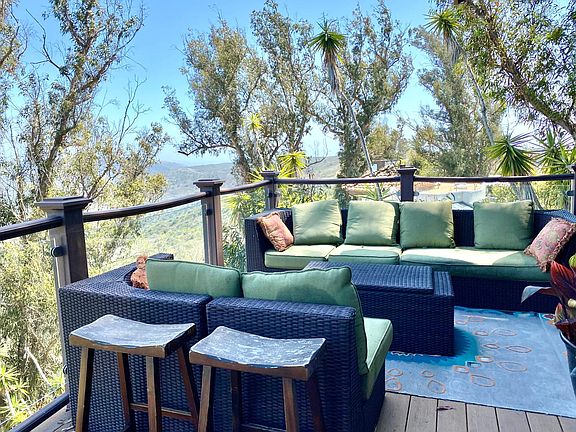 This stunning wood and glass home offers sweeping views in a serene setting. The high quality remodeled craftsman interiors include newer baths, wood floors, walls, panoramic view deck and more. A spacious floor plan presents flexible living areas with two main level bedrooms and two upper level bedrooms. The master bedroom has a private secluded sundeck with a peekaboo ocean view. The spectacular large living room is accented with soaring beamed ceilings, oak flooring, impressive fireplace and walls of glass that bring in vistas of mountains, Aliso Wood Canyon Park and views of the distant Pacific Ocean. A contemporary kitchen includes stainless appliances, stone counters and ample storage. The large entertainment deck flows from two living areas to offer wilderness views, sunrise to sunset. An oversized two-car garage provides direct access to the main living areas and includes an ample storage area that can also be used as a fitness area. Apart from the master bedroom, there are two bedrooms with great views that could also be used as spacious private offices. The entry boasts an inviting street-side decking with secure fencing - ideal for outside activities. Two additional large storage rooms are available on a lower level. The setting could not be more ideal as hiking trails, a community park, a famous mountain biking trail network, tennis, TOW elementary school and wilderness park access are all within walking distance. Four minute drive reaches the beaches, shops and restaurants of Laguna Beach. Pet friendly environment. Tenant pay for all utilities. Owner pays for garden and tree services. No smoking.