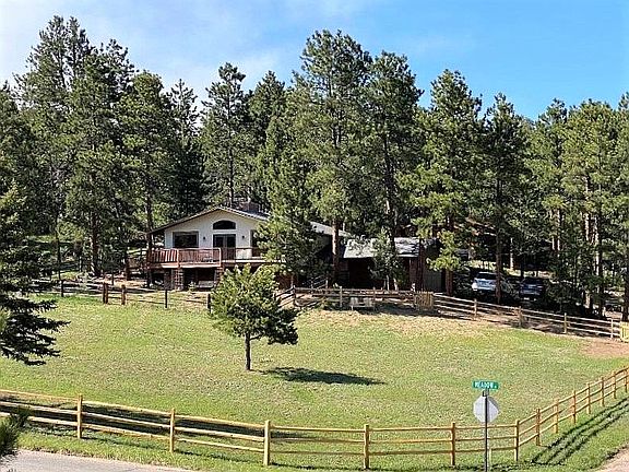 Gorgeous upgraded ranch home offering 4 beds, 3 full baths, boasting gorgeous mountain & open space views! Perfectly nestled among majestic pines & across from 420 acre open space park. Steps to miles of trails leading to nearby Evergreen Lake. Welcoming remodeled home has an ideal open floor plan offering a vaulted great room, dining room & with wood beam accents & gorgeous views! Great room has large windows framing mountain views & floor to ceiling stone fireplace. French doors to expansive deck w amazing vistas; ideal for relaxing & entertaining. Spacious dining area has gleaming oak hardwood flooring. Gourmet kitchen includes slab granite, island w gas cooktop, SS appliances, breakfast bar, custom cabinetry, breakfast nook, wood floor. Large deck off kitchen w direct garden access. Main level master retreat features access to large private deck w built-in hot tub. Custom built walk-in closet. Luxurious spa like 5-piece master bath has soaker tub, large frameless glass shower w 3 shower heads, water closet & gorgeous tile flooring. Garden level basement boasts a spacious rec room featuring an impressive full wet bar & cozy wood burning brick fireplace w gas hookup for future insert. 3 additional bedrooms, indoor workshop, full bathroomcomplete the lower level. Full guest bathroom on main. Convenient main level laundry room w utility sink, tile flooring. Additional amenities include: all 3 baths w custom floating Brazilian Cherry vanities & wall mounted floating commodes, Pella double pane windows, T&G ceilings, ceiling fans. 3 decks, new inner yard fence, fenced garden, 2 car attached garage, utility shed. Walk to dining, public transit, parks, trails. Close to shopping, schools, golf & trail heads. 25 minutes to Denver, 45 minutes for skiing. See virtual 3-D tour.