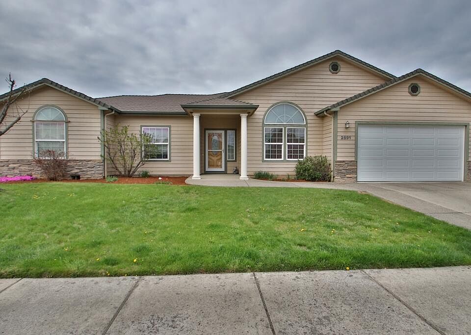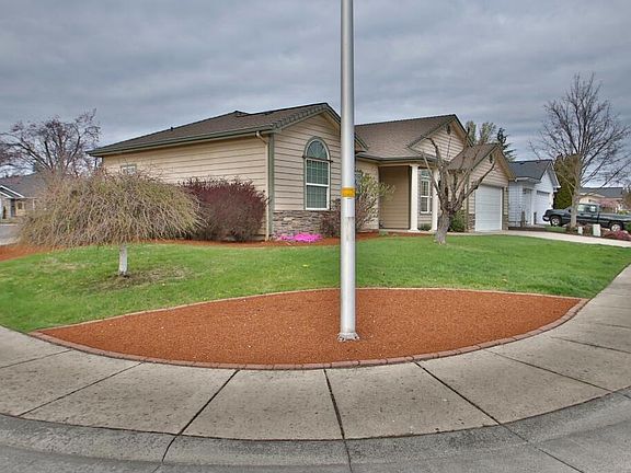 This home is vacant and available for a very quick Escrow closing! This 3 bedroom, 2 bath contemporary, single-story home is located on a corner lot in the beautiful Central Point East Subdivision and close to Costco. The open floor plan features high ceilings, a large kitchen with granite counters and a split bedroom design. The large primary bedroom features a large walk-in closet, French doors to the rear patio, and a large bathroom with double sinks, a jetted tub, shower, and a water closet. Updates include an HVAC System, Water Heater, Insulated Garage Door, and a Gutter Leaf Guard System. You will certainly enjoy the huge covered rear patio and private back yard with a garden shed!