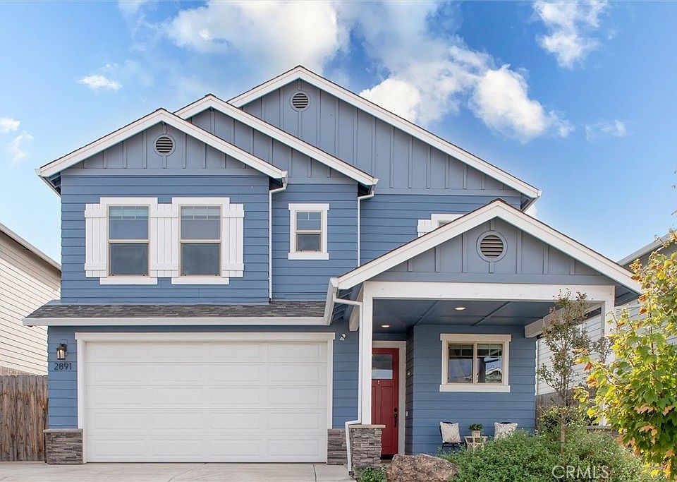 This absolutely turn-key home is cute, cute, cute! It was built in 2018 and is located in the Oak Valley Subdivision off of HWY 32, in East Chico. Great location with quick access to many amenities and a straight shot to HWY 99. A covered front porch greets you as you walk up to the red front door. Upon entering, you look up to soaring ceilings and walk in to an open entry area. Off the entry, there is a half bathroom downstairs, as well as under-the-stair, deep storage. The kitchen, dining, and living room are open concept. Gorgeous, luxury vinyl plank flooring is located throughout the whole downstairs, and upstairs in both bathrooms. Upstairs are all three bedrooms, a guest bathroom and laundry room. The primary bedroom's ensuite bathroom has double sinks, walk-in tile shower, private toilet, and a walk-in closet. This home is light and bright with lots of windows, and a south facing, "big-sky" view. In the backyard there is a low-maintenance yard and an awesome gazebo. Owned solar panels produced over 8000 kwH in 2021. Additional features include a whole-house fan, tankless water heater, whirlpool kitchen appliances, and upstairs laundry room! Make sure to check out the 3D virtual walkthrough tour!