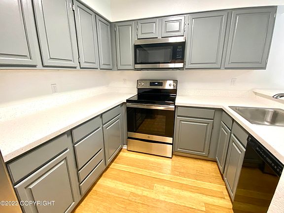 Well-kept Condo Home in West Anchorage with garage and storage space. Nicely designed kitchen with brand new appliances and updates. Washer and dryer in unit. Each bedroom has its own bathroom. Cozy fireplace in freshly painted open dining/living area. Patio area and deck w/ storage. Carpet and hardwood flooring. Dues include: exterior & grounds maintenance, refuse, sewer, snow removal and water.