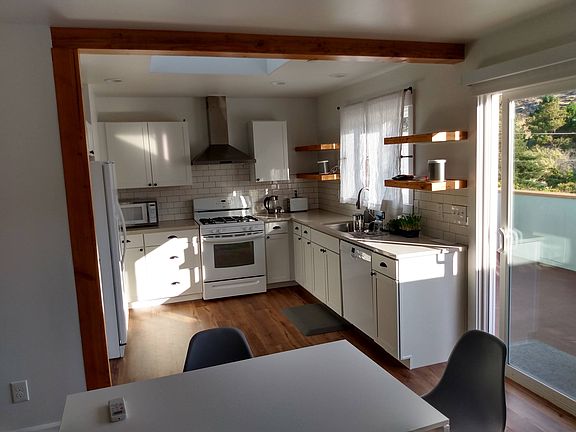 Built in 2019, scenic views and natural light abound in this custom apartment in a quiet neighborhood. Skylights and an open floor plan create bright, airy interior combining with wood accents to make this space the perfect balance of style and comfort. Watch the sunset with friends on 200 sqft deck flowing into living room. Hiking and biking trails only a block away. Full kitchen with quartz countertops, dishwasher, and full size gas range. Bathroom includes built in makeup station, separate from vanity, beautifully tiled tub/shower and decorative laminate wood flooring. Plenty of storage between walk in closet, extensive bathroom cabinetry, coat closet, pantry, and ground level utility closet. Private entrance above 2 car garage. On site parking and private washer and dryer included. See this lavish space for yourself! Available now. Tenant pays utilities. Pet's are not allowed.