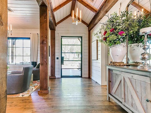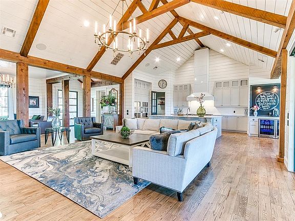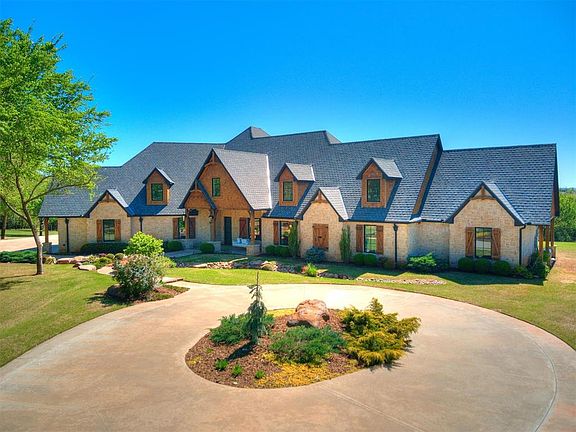 Beautiful home nestled on 4.8 acres! Custom built 6 bed, 6 1/2 bath with oversized 4 car garage. Step into this entertainer's dream home, starting with a stunning cathedral living room with cedar beams, marble fireplace and solid oak floors. Gourmet Chef kitchen with Viking 60"Professional range, double ovens, Gallery sink with inserts, Thermador refrigerator and freezer, and commercial vent hood. The primary bedroom suite offers high ceilings and with room for a sitting area, and a spa-like en suite bathroom including a soaking tub, 6 head shower and 2 large walk in closets (1 being a safe room). Downstairs you have 4 more bedrooms each with an en suite bathroom & walk-in closet, 2 with private loft areas. Upstairs is a beautiful guest suite, full bath and walk-in closet, exercise room & sitting room or bonus room. Enjoy your own private movie theatre with 160 inch screen, 7.1 Dolby sound system and 14 power recliners. Large screened in porch and outdoor covered grill area to enjoy year round! New security system with cameras. New roof. Smart lights and smart speakers in living room and on the patio.