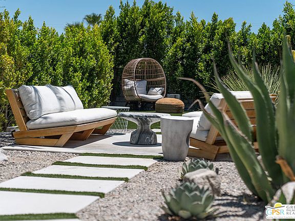 Welcome to 2893 E Valencia Rd in sunny Palm Springs, offered turn key furnished. Situated on a prime, private, corner lot, this home offers a seamless blend of indoor and outdoor living spaces, perfect for today's desert lifestyle. Inside you will find bright and airy interiors, where expansive windows frame picturesque views and bathe the space in natural light. The open concept living area encompasses a beautifully designed kitchen with oversized island and bar seating, separate dining and breakfast areas, living room that opens to the pool, and access to both exterior entertaining areas. The primary suite is spacious with an oversized en suite bath and provides access to the backyard. Two additional guest bedrooms of styled spaces for family and friends to retreat to. Venture outside to discover a true oasis, masterfully crafted by landscape architect Tim Turner. The landscape and hardscape are thoughtfully designed to provide a unique outdoor-living experience that captures all the natural beauty that makes Palm Springs so unforgettable. The hardscape features elegant stonework and curated desert scaping that creates inviting spaces for dining, lounging, and recreation both day and night. Every detail is designed to elevate your lifestyle. This is more than a home; it's a private paradise in the heart of Palm Springs.