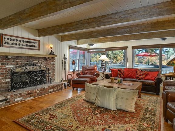 Lake Arrowhead, Winter Harbor Cove lakefront cottage. Gated North Shore Estates Association + its own gate. Included are: Half-a-double dock is just steps away with electricity & water, dock house trimmed inside with imported teak, 26' Cobalt with Hydrohoist & home furnishing + security camera system. 3 BR upstairs + bath; one BR downstairs + BA; separate guest quarters + BA, heat + A/C, workshop/storage with a fridge, gas BBQ on the lakefront deck. Cozy and upgraded while maintaining the original character. Magnificently landscaped. Hike to the Marina & Village along miles of lakeside trails. What are you waiting for Escape the madness''