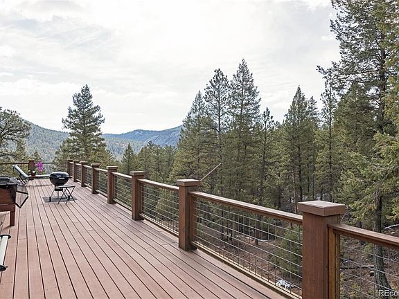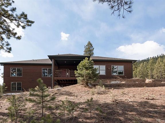 Thirty-seven acres of privacy, pines, and views just begin to describe this little slice of Colorado heaven. Upon entering you will begin to appreciate the vaulted tongue-n-groove wood ceiling, open layout, hardwood floors and many windows that offer the cherished mountain view. The spacious kitchen is appointed with granite tile countertops, island seating, extra prep cabinet, double oven, cook top, and pantry. Just off the kitchen is a bar, dining room, and great room with deck access. The expansive deck provides views from the open as well as the covered areas and is perfect for entertaining large parties or those intimate gatherings. Floor-to-ceiling stone fireplace in the great room features built-in cabinets for your TV and/or sound system. Large main floor master suite with 5-piece bathroom includes a jetted tub, tile shower and adjacent walk-in closet. Two guest bedrooms, full bathroom, and laundry with utility sink complete the main floor living. The lower level walk out has tall ceilings, stone fireplace, and a fully equipped wet bar with mini fridge, dishwasher, sink, stone tile countertops embossed with wildlife etchings reminiscent of our local "neighbors". A hand selected, natural cut wood piece finishes the countertop to the island that easily seats 6 guests. Spacious and open best describe this perfect game room area. This level also offers another bedroom adjacent full bathroom and second master suite with 5-piece bathroom, and exterior access to the covered patio, thus allowing the possibility for extended family living. Explore the great outdoors and extend the hiking trail to the top of your land for the coveted Pikes Peaks views. Two-car oversized garage easily fits your truck. Paved driveway with easy turn around capability and lots of room for your RV or many toys! Cell phone and internet is good at the house as the husband (IT guy) and wife work from home.