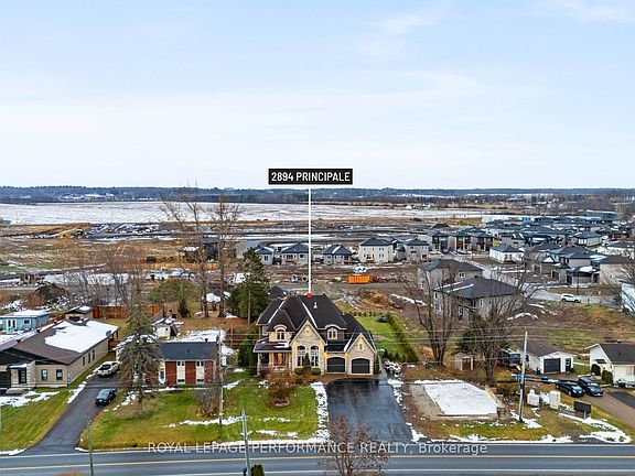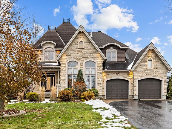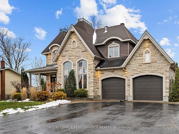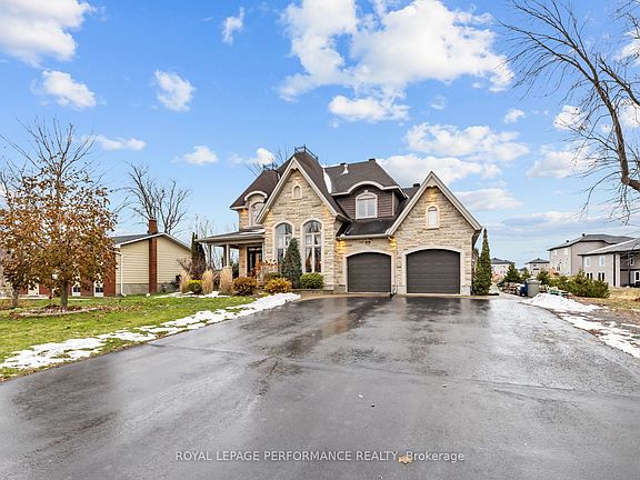 Welcome to this stunning 4-bedroom, 3-bathroom home offering over 3,200 sq/ft of refined living space, set on a one-of-a-kind lot fronting onto breathtaking sunset views over the river. Featuring 9 ft ceilings throughout and soaring vaulted ceilings up to 14 ft, this home blends grand architecture with warm, timeless finishes. A spacious foyer opens into an inviting living room highlighted by a striking stone fireplace extending to the ceiling. The dream kitchen boasts granite countertops, ample cabinetry, and direct access to the outdoors-perfect for entertaining. Enjoy two dining areas: a bright breakfast/dining nook with patio access, plus a formal dining room featuring charming columns. A versatile room adds flexibility for a home office, playroom, or quiet retreat overlooking your backyard oasis. The ideal family layout continues upstairs with four generous bedrooms. The primary suite includes a luxurious 5-piece ensuite & makeup vanity, and a large walk-in closet. Three additional well-sized bedrooms and a full bath complete this level. The partially finished lower level offers incredible potential, complete with a rough-in for an additional bathroom-ready to customize. Your private backyard features a 33' x 12' heated saltwater pool, pergola, interlock patio, firepit area, storage shed, and plenty of green space for kids to play. Hedges add privacy, while the front of the home showcases unmatched curb appeal with its grand covered porch, double-entrance oversized driveway, and extended 2-car garage. Bonus: a full volleyball court for summer fun. All municipal services, outdoor generator outlet, hardwood and tile throughout, exceptional layout, and views that make every sunset feel like home.